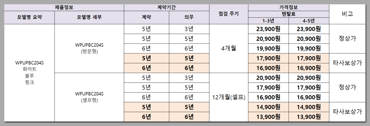 타사보상 할인 (최근 6개월 이내 타사 제품 렌탈료 납부 영수증: 5년, 6년 계약시)