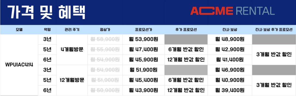 타사보상 할인 (최근 6개월 이내 타사 제품 렌탈료 납부 영수증: 5년, 6년 계약시) 타사 보상시 3개월 반값 할인